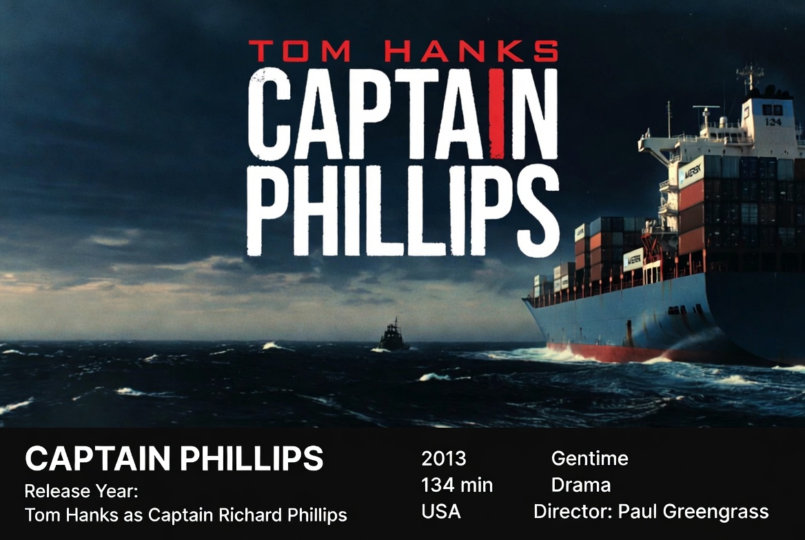 主人公はマースク・アラバマ号の船長リチャード・フィリップス、主演は トム・ハンクス、監督はポール・グリーングラス、配信元:プライムビデオ